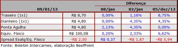 No atacado da carne bovina, o equivalente físico registrou valorização de 0,20%, fechado a R$100,08. O spread (diferença) entre o índice do boi gordo e equivalente físico foi de -R$2,50 e sua variação teve alta de R$0,37 no dia. Confira a tabela abaixo.