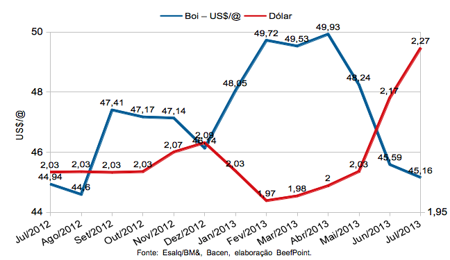 Na quarta-feira (10), o dólar valorizou 0,50% e foi cotado em R$2,27. O boi gordo em dólares registrou desvalorização de 0,42% sendo cotado a US$45,16. Verifique as variações ocorridas no gráfico acima.