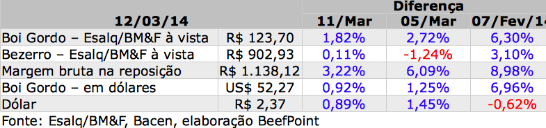 O contrato futuro do boi gordo para abr/14 apresentou alta de R$ 0,11 e foi negociado a R$ 123,08, em relação ao dia anterior.