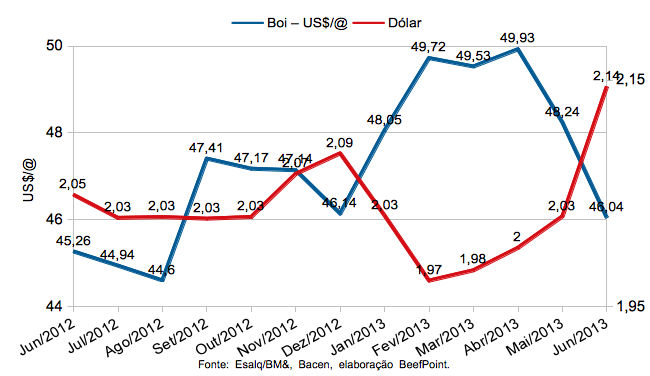 Na quinta-feira (13), o dólar valorizou 0,12% e foi cotado em R$2,14. O boi gordo em dólares registrou desvalorização de 0,04% sendo cotado a US$46,04. Verifique as variações ocorridas no gráfico acima.
