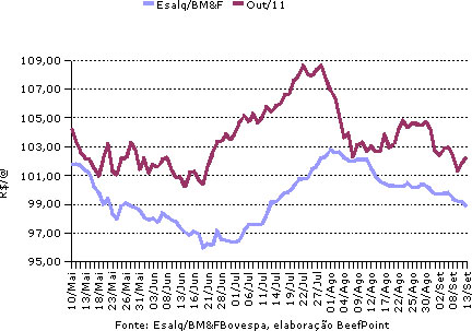 Gráfico 1. Indicador Esalq/BM&FBovespa boi gordo à vista x contratos futuros para outubro/11