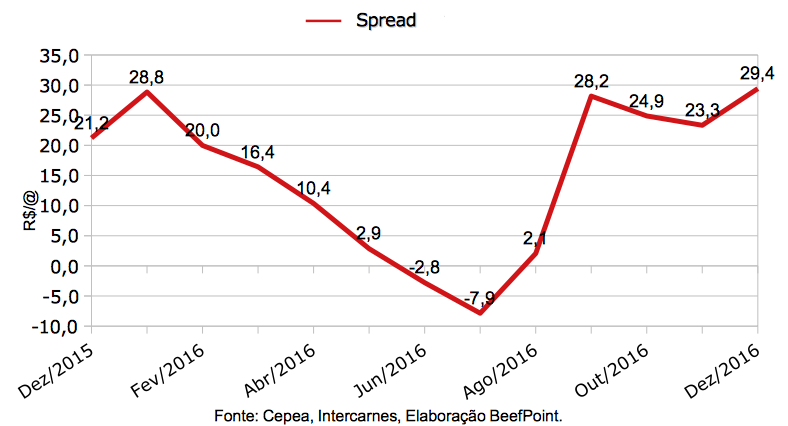 O Spread é a diferença entre os valores da carne no atacado e do Indicador do boi gordo. Desta forma, um Spread positivo significa que a carne vendida no atacado está com valor superior ao do boi comprado pela indústria, deixando assim esta margem bruta positiva e oferecendo suporte ou potencial de alta para o Indicador, por exemplo.