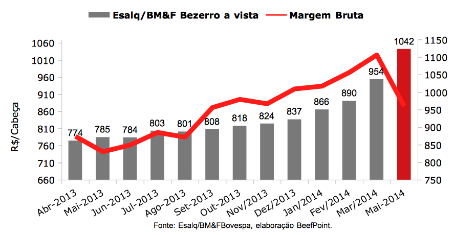 Gráfico 1. Indicador Esalq/BM&FBovespa bezerro à vista x margem bruta