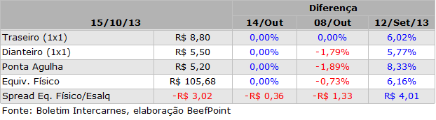 No atacado da carne bovina, o equivalente físico foi fechado a R$105,68. O spread (diferença) entre os valores da carne no atacado e do Indicador do boi gordo foi de -R$3,02 e sua variação teve baixa de R$0,36 no dia. Confira a tabela abaixo.