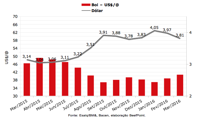 | Fonte: Esalq/BM&F, Bacen, elaboração BeefPoint | ||||