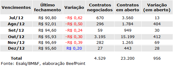O contrato futuro do boi gordo para Ago/12 foi negociado a R$ 92,01 e sua variação teve baixa de 0,50%.