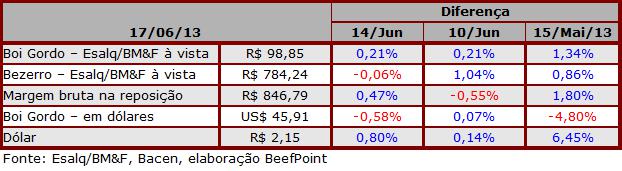 Indicador do boi gordo à vista teve valorização de 0,21%, cotado a R$98,85/@. Bezerro registrou desvalorização de 0,06%, cotado a R$784,24/cabeça. Dólar teve valorização de 0,80% e foi cotado a R$2,15.