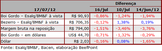 O contrato futuro do boi gordo para Ago/12 foi negociado a R$ 91,35 e sua variação teve baixa de 0,66%.