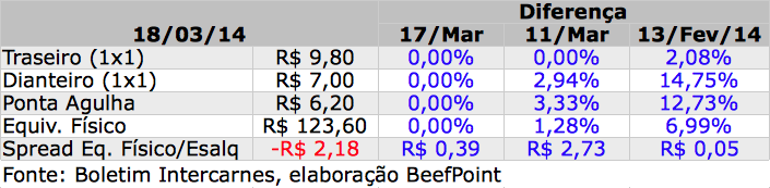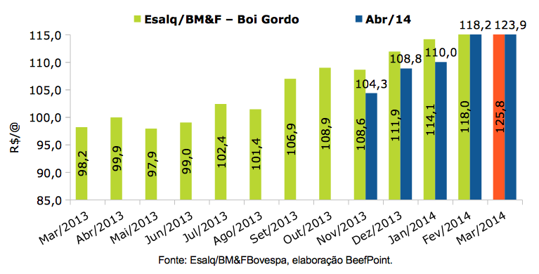 O contrato futuro do boi gordo para abr/14 apresentou alta de R$ 1,50 e foi negociado a R$ 123,90, em relação ao dia anterior.