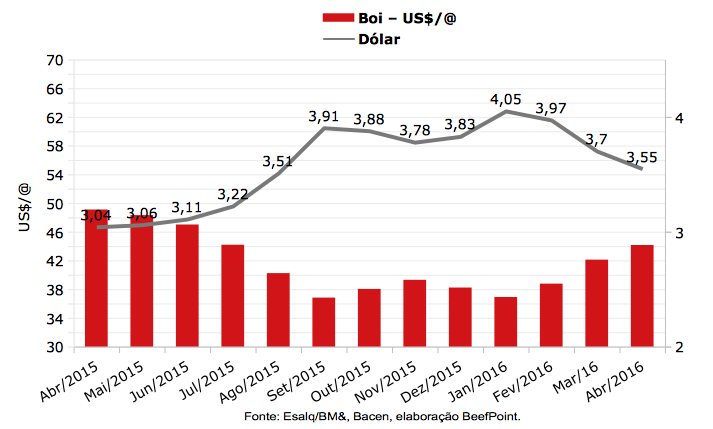 | Fonte: Esalq/BM&F, Bacen, elaboração BeefPoint | ||||
