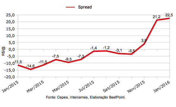O Spread é a diferença entre os valores da carne no atacado e do Indicador do boi gordo. Desta forma, um Spread positivo significa que a carne vendida no atacado está com valor superior ao do boi comprado pela indústria, deixando assim esta margem bruta positiva e oferecendo suporte ou potencial de alta para o Indicador, por exemplo.
