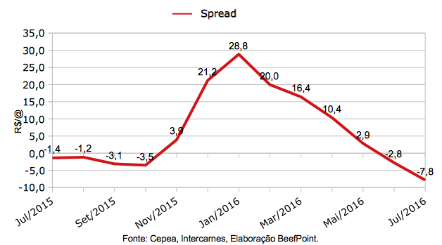 O Spread é a diferença entre os valores da carne no atacado e do Indicador do boi gordo. Desta forma, um Spread positivo significa que a carne vendida no atacado está com valor superior ao do boi comprado pela indústria, deixando assim esta margem bruta positiva e oferecendo suporte ou potencial de alta para o Indicador, por exemplo.
