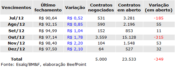 O contrato futuro do boi gordo para Ago/12 foi negociado a R$ 92,15 e sua variação teve alta de 0,85%.