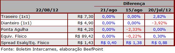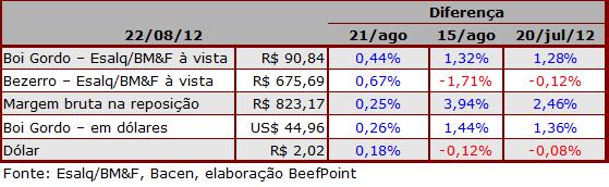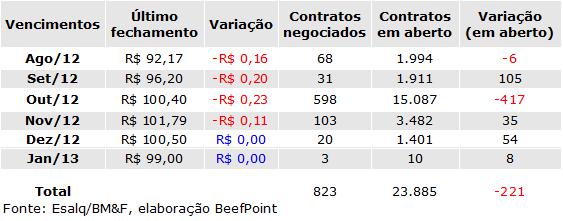 O contrato futuro do boi gordo para Set/12 foi negociado aR$96,20 e sua variação teve baixa de R$0,20.