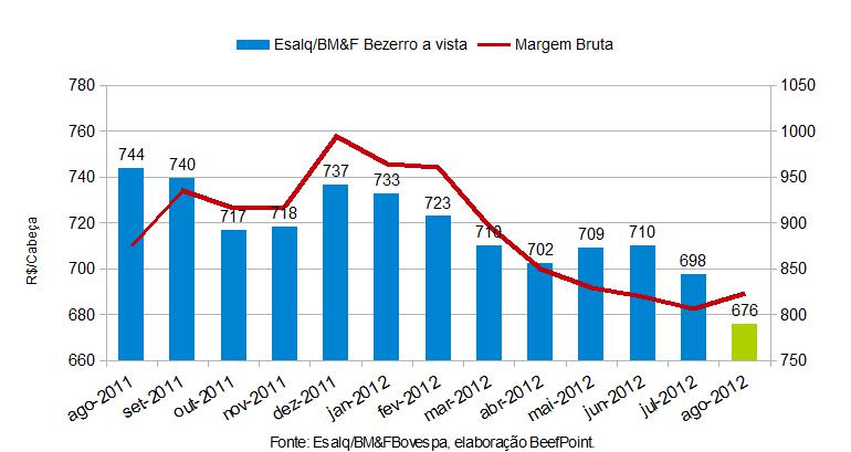 Gráfico 1. Indicador Esalq/BM&FBovespa bezerro à vista x margem bruta