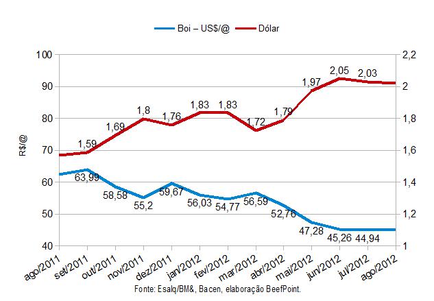 Gráfico 2. Indicador de Esalq/BM&FBovespa boi gordo à vista em dólares e dólar