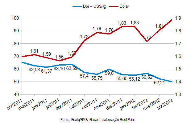 Gráfico 2. Indicador de Esalq/BM&FBovespa boi gordo à vista em dólares e dólar