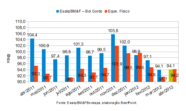 O contrato futuro do boi gordo para Mai/12 foi negociado a R$96,95 com alta de R$ 2,23.