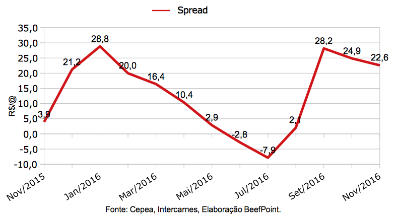 O Spread é a diferença entre os valores da carne no atacado e do Indicador do boi gordo. Desta forma, um Spread positivo significa que a carne vendida no atacado está com valor superior ao do boi comprado pela indústria, deixando assim esta margem bruta positiva e oferecendo suporte ou potencial de alta para o Indicador, por exemplo.