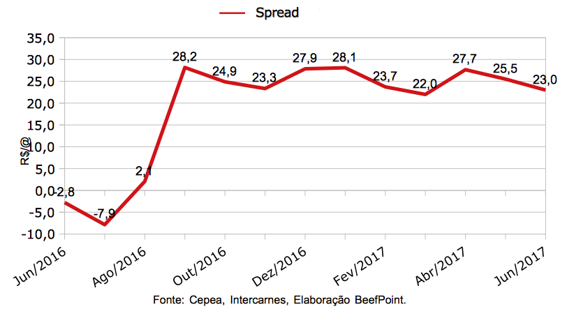 O Spread é a diferença entre os valores da carne no atacado e do Indicador do boi gordo. Desta forma, um Spread positivo significa que a carne vendida no atacado está com valor superior ao do boi comprado pela indústria, deixando assim esta margem bruta positiva e oferecendo suporte ou potencial de alta para o Indicador, por exemplo.