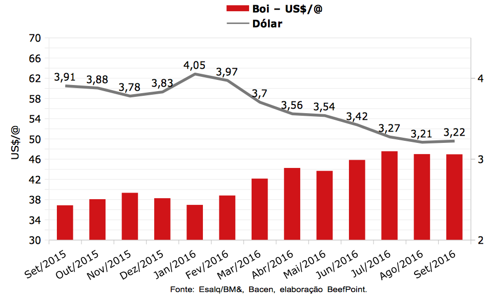 | Fonte: Esalq/BM&F, Bacen, elaboração BeefPoint | ||||