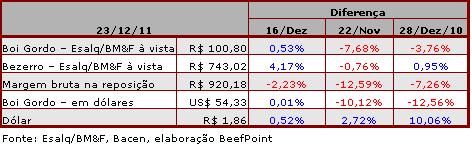 O contrato futuro do boi gordo para janeiro/2012 foi negociado a R$99,08 com alta de R$0,19.