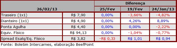 No atacado da carne bovina, o equivalente físico manteve-se estável, fechado a R$94,13. O spread (diferença) entre o índice do boi gordo e equivalente físico foi de R$3,82 e sua variação teve baixa de R$0,33 no dia. Confira a tabela abaixo.