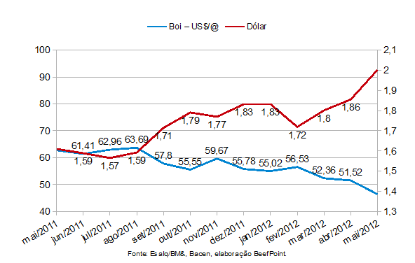 Gráfico 2. Indicador de Esalq/BM&FBovespa boi gordo à vista em dólares e dólar