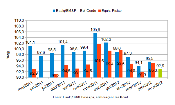 O contrato futuro do boi gordo para Jun/12 foi negociado a R$ 95,35 com alta de R$ 0,10.