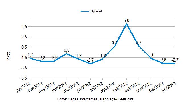 *Spread: é a diferença entre os valores da carne no atacado e do Indicador do boi gordo.