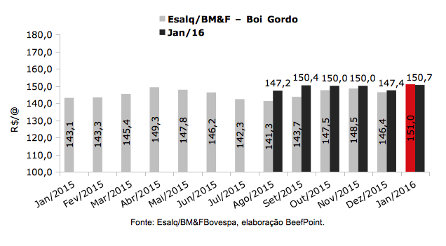 O contrato futuro do boi gordo para jan/16 apresentou baixa de R$ 0,16 e foi negociado a R$ 150,65 em relação ao dia anterior.