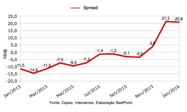 O Spread é a diferença entre os valores da carne no atacado e do Indicador do boi gordo. Desta forma, um Spread positivo significa que a carne vendida no atacado está com valor superior ao do boi comprado pela indústria, deixando assim esta margem bruta positiva e oferecendo suporte ou potencial de alta para o Indicador, por exemplo.