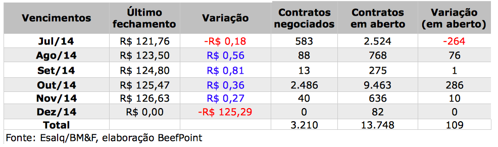 O contrato futuro do boi gordo para ago/14 apresentou alta de R$ 0,56 e foi negociado a R$ 123 50, em relação ao dia anterior.