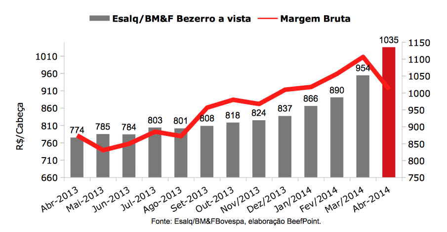 Gráfico 1. Indicador Esalq/BM&FBovespa bezerro à vista x margem bruta