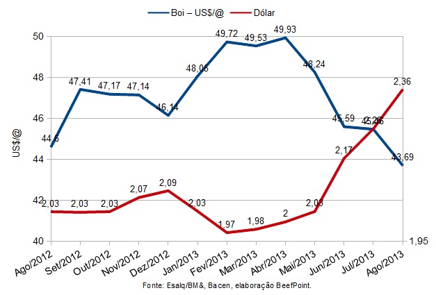 Na quinta-feira (29), o dólar desvalorizou 0,27% e foi cotado em R$2,36. O boi gordo em dólares registrou valorização de 0,33% sendo cotado a US$43,69. Verifique as variações ocorridas no gráfico acima.