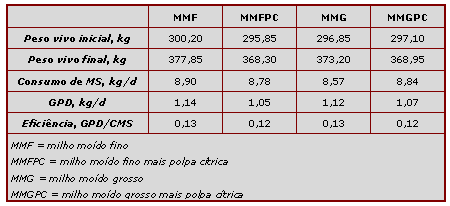 Dessa forma, com base nos resultados desse trabalho, podemos afirmar que a moagem fina dos grãos de milho, em partículas menores que 1,2 mm é desejável para maximizar o desempenho, e que a substituição de parte desses grãos por polpa cítrica pode ser uma ótima alternativa para aumentar a lucratividade da operação, sempre que o preço do subproduto for interessante, como no caso deste estudo.