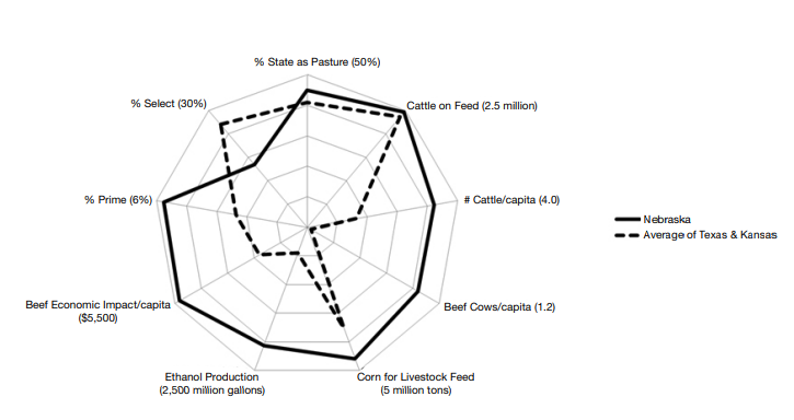 Os próximos dois estados para a produção de boi gordo são Texas e Kansas. A Figura 1 mostra uma comparação de Nebraska com a média desses dois estados em várias áreas que apoiam a produção de carne bovina. Esse número demonstra a importância da produção de carne bovina para o estado. A evidência da natureza de alta qualidade da carne bovina produzida em Nebraska pode ser encontrada nos dados que mostram que o estado produz uma porcentagem maior de Prime (o mais alto grau de qualidade do USDA) e uma porcentagem menor de carne bovina Select do que nossos concorrentes mais próximos.