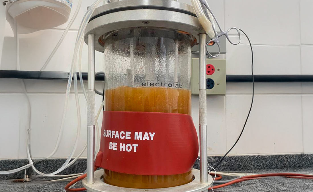 Biorreator de bancada usado para a fermentação que produz os soforolipídios (Foto: arquivo pessoal)