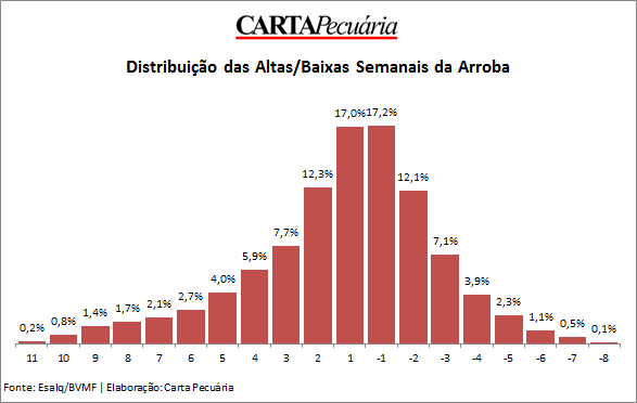 É muito importante acompanhar quantas semanas a arroba caiu consecutivamente porque não é fácil derrubar os preços, caro leitor. Existe toda uma resistência, mesmo na safra, de derrubar os preços por várias semanas seguidas. Abaixo mostro um gráfico disso na prática. Ele mostra as quedas e altas semanais da arroba.