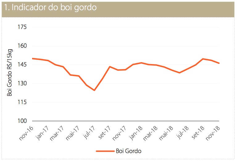 O ano de 2019 deve ser de resultados mais positivos para todos os elos da cadeia de carne bovina no Brasil. Destacam-se como principais pontos a serem observados no ano: a continuação do crescimento das exportações, a provável aceleração do consumo interno e o crescimento da oferta em ritmo mais lento. É importante ressaltar também que, apesar da maior disponibilidade prevista para o milho no mercado local, a compra de animais de reposição devem ficar mais caras, já a partir de 2019.