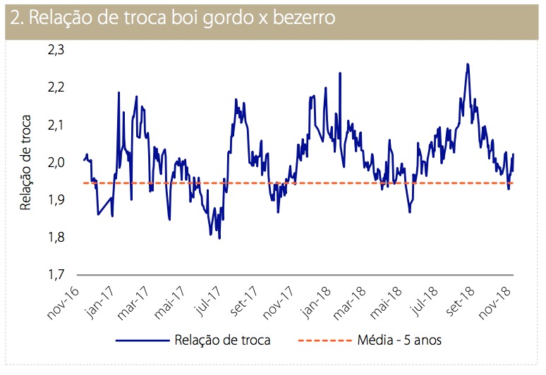 Quanto aos custos de produção para sistemas intensivos e semi-intensivos, a relação de troca entre o boi gordo e o bezerro (ou boi magro) deve confirmar a inversão da tendência em 2019 e passar a valorizar mais os animais jovens – beneficiando o produtor de cria. Tendência que deve se acentuar em 2020. Em relação ao milho, a oferta do produto deve crescer em relação ao ano de 2018, aumentando a disponibilidade para a produção de ração animal.