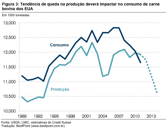 A produção de carne bovina dos Estados Unidos deve cair materialmente nos próximos dois anos. A seca que começou em 2011 no Texas e em Oklahoma se disseminou para áreas maiores e impactou em uma proporção bem maior do rebanho bovino dos Estados Unidos. Apesar de essa questão ter sido amplamente debatida nos últimos dois anos, o Credit Suisse acredita que as implicações negativas para a produção de carne bovina dos Estados Unidos ainda estão sendo subestimadas pelos mercados de capital.