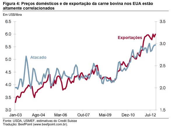 A escassez na oferta é refletida na tendência de preços da carne bovina. A Figura 4 mostra a evolução dos preços atacadistas domésticos da carne bovina nos Estados Unidos e os preços de exportação. Embora os preços atacadistas tenham permanecido relativamente estáveis entre 2003 e começo de 2010, os preços de exportação mostraram a tendência de alta mais clara desde 2003. A correlação entre os preços é obviamente forte e os preços domésticos acompanharam a acentuada tendência de crescimento observada nos últimos três anos. Para o futuro, o Credit Suisse espera que os preços aumentem mais à medida que a oferta continua com uma tendência de baixa.