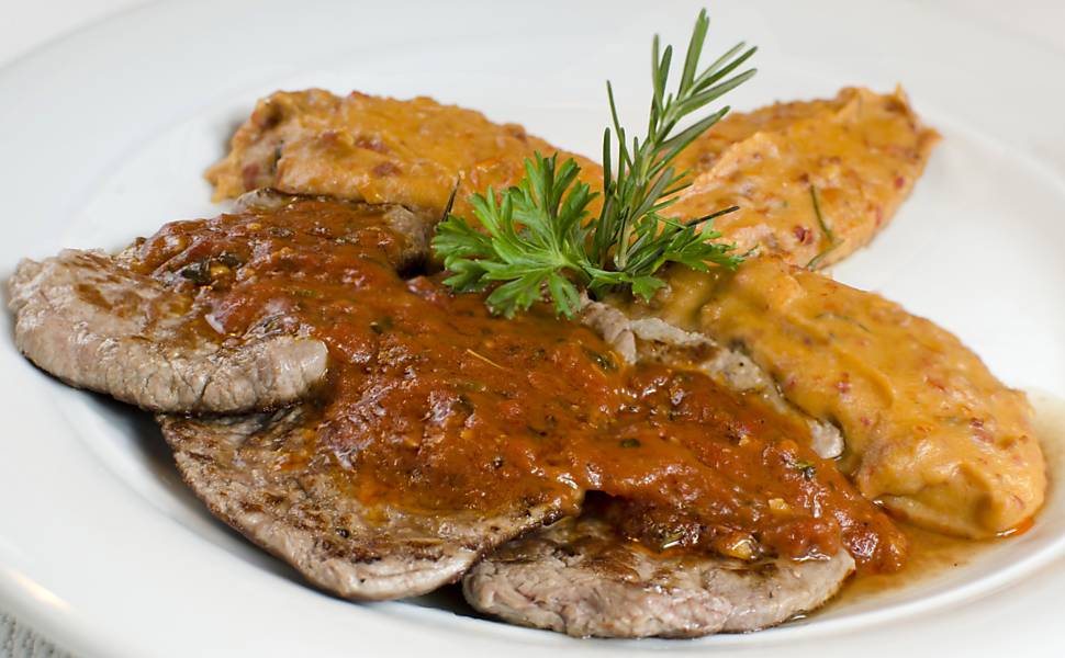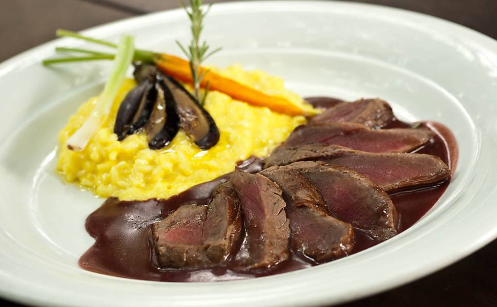 Opção de jantar do L’Amitié, o leque de alcatra ao molho de vinho do Porto é acompanhado por risoto de cúrcuma e minilegumes