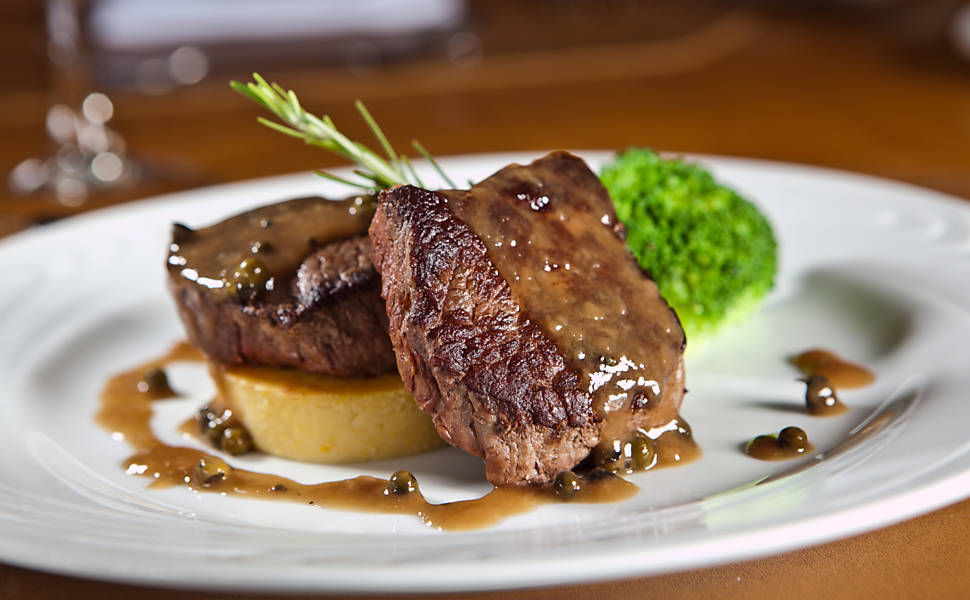 O Limonn, casa do Itaim Bibi, serve escalope de filé-mignon ao molho de vinho com brócolis e batata assada recheada de queijos