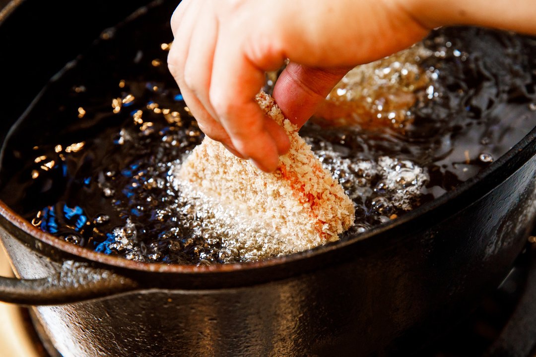 Para fazer o sanduíche de US$ 180, eles primeiro fritam o corte empanado.
