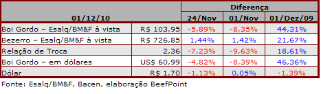 No mercado futuro, os contratos de boi gordo negociados na BM&FBovespa apresentaram forte retração. O primeiro vencimento, dezembro/10, registrou queda de R$ 4,66 na semana e terminou o pregão da última quarta-feira valendo R$ 96,71/@.
