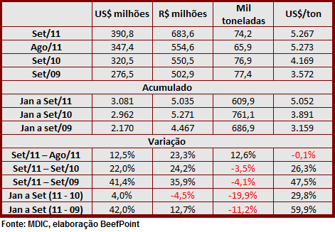 Em setembro as exportações brasileiras de carne bovina in natura foram de 74.200 toneladas, gerando US$ 390 milhões de receita. Em relação a agosto/2011, houve aumento de 12,6% das exportações em volume e de 12,5% em valor. Comparado ao mesmo mês em 2010, o volume caiu (-3,5%) e a receita foi maior (22%).