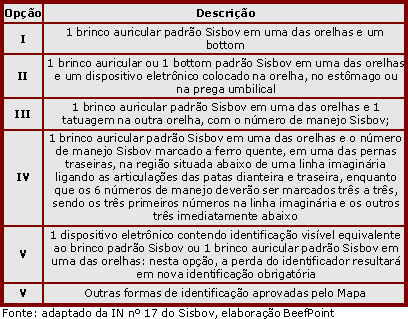 “A identificação individual de bovinos ou bubalinos será única em todo o território nacional e utilizará código de até 15 (quinze) dígitos numéricos, emitido e controlado pela SDC na BND, na forma regulamentada por esta Norma” (art. 15, cap III). A norma define 6 opções de identificação dos bovinos e bubalinos, sintetizados na tabela 1. As duas últimas opções mantêm a flexibilidade da norma para adaptações e para o sistema eletrônico, ainda não regulamentado.