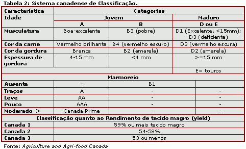 O sistema Canadense de classificação de carcaças foi baseado no Americano, sendo ambos bastante semelhantes quanto aos critérios de classificação. Os principais pontos deste sistema são a maturidade, musculosidade, grau de marmorização, coloração da carne e gordura, e espessura da gordura de cobertura. Animais jovens recebem classificação A ou B e carcaças de animais maduros são classificadas como D, e de touros como E. As carcaças no Canadá, assim como nos EUA, também recebem classificação de acordo com o rendimento de tecido magro, dado pela equação: